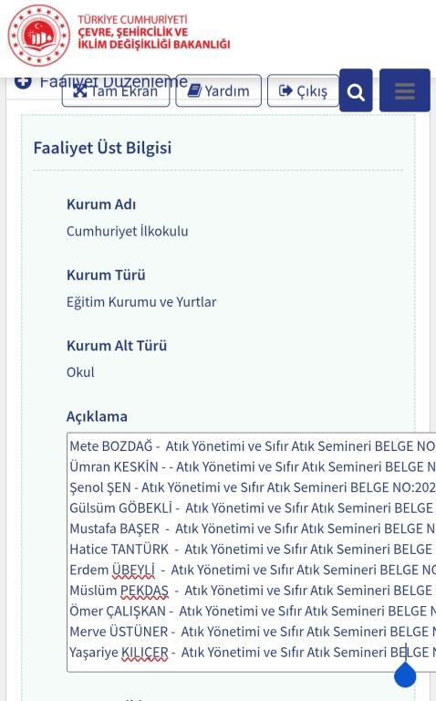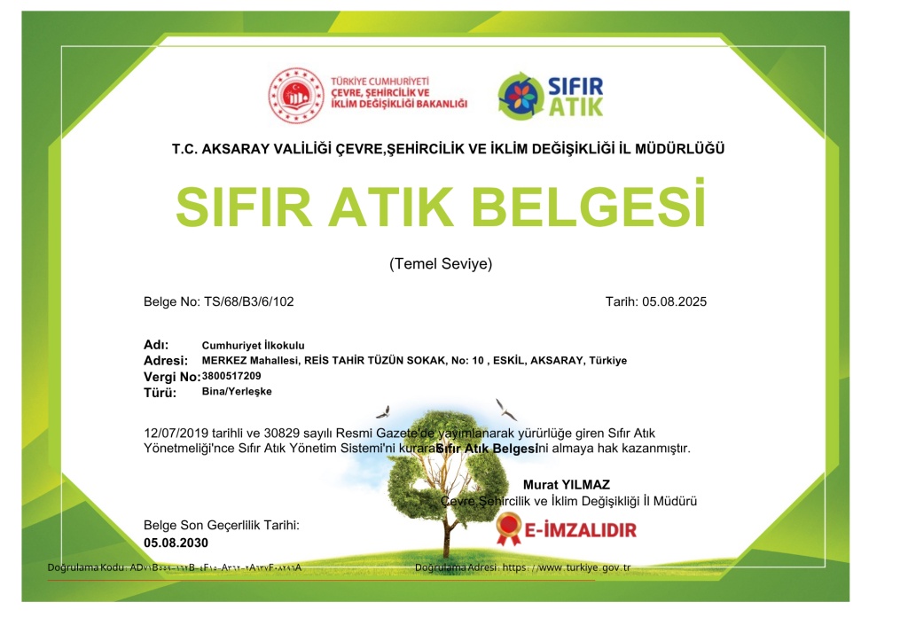 "Sıfır Atık Yönetim Sistemi " ne ilişkin yazılı ve görsel tüm belge ve dokümanlar Çevre, Şehircilik ve İklim Değişikliği Aksaray İl Müdürlüğü'nce değerlendirilerek, okulumuz temel seviyede " Sıfır Atık Belgesi " almaya hak kazanmıştır.